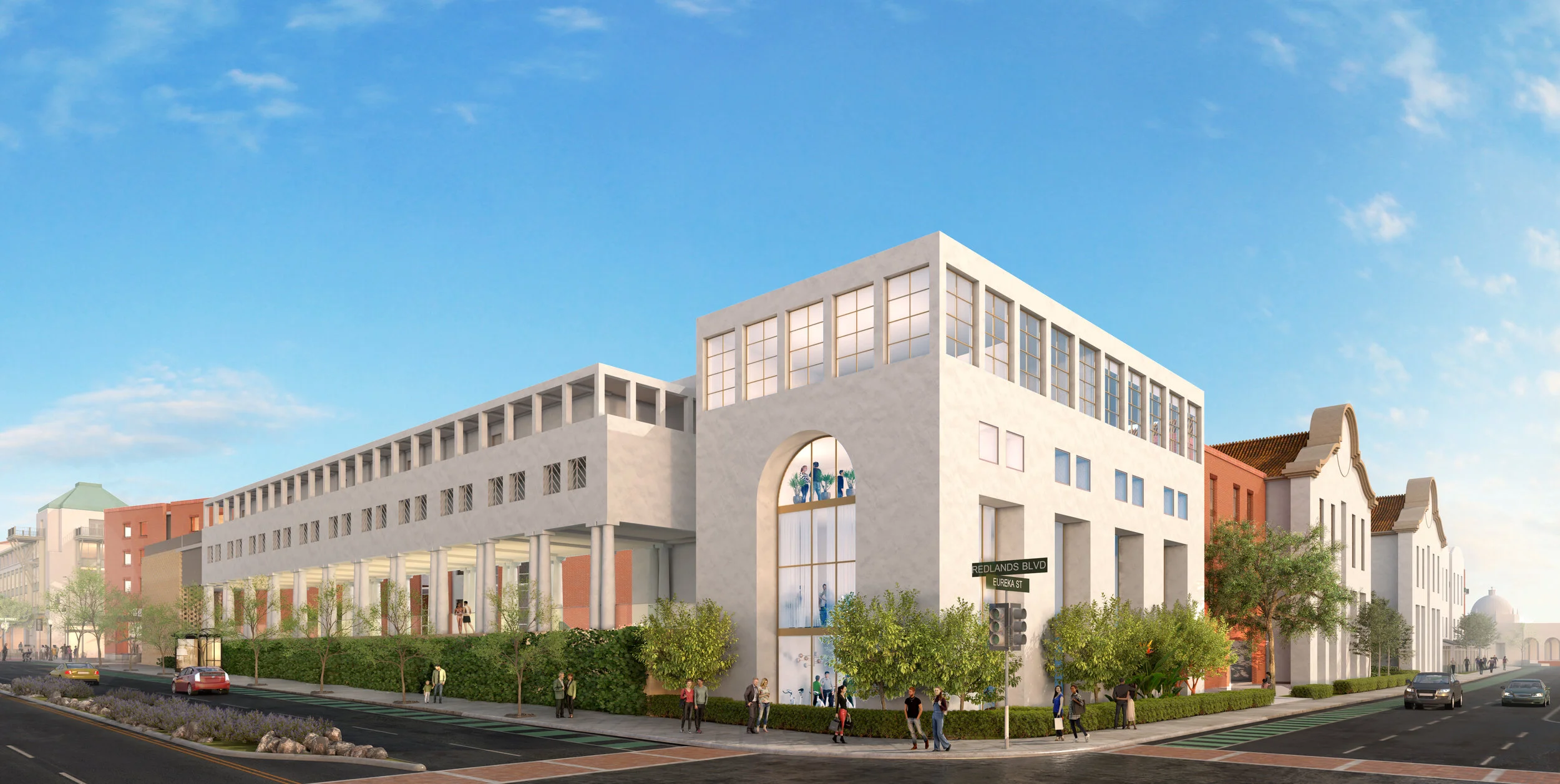 A mixed-use building at the corner of Redlands Boulevard and Orange Street will provide creative office space for local businesses and a rooftop restaurant. Hidden from view on the street, a multi-level parking structure will provide off-street parking for office and retail uses on this block.